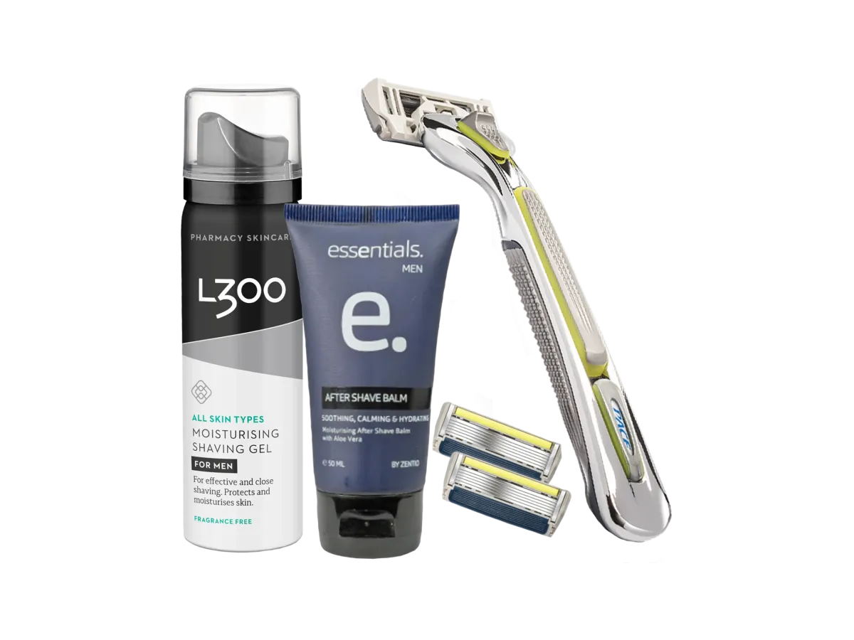 Få en komplett rakupplevelse – Pace6 rakhyvel med 6 blad, Essentials After Shave Balm och L300 Shaving Gel för en tät och bekväm rakning.
